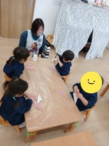 「1の指で糊をつけますよ~」